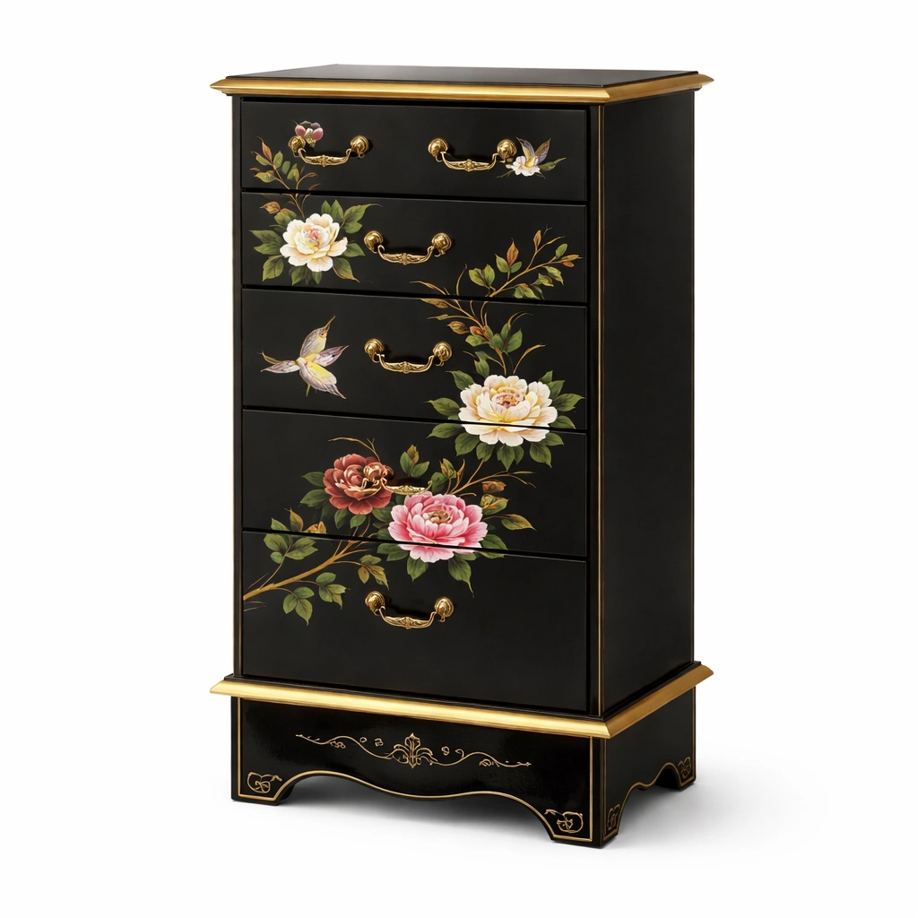 Kommode Holz Schwarz mit Blumenmuster und 5 Schubladen