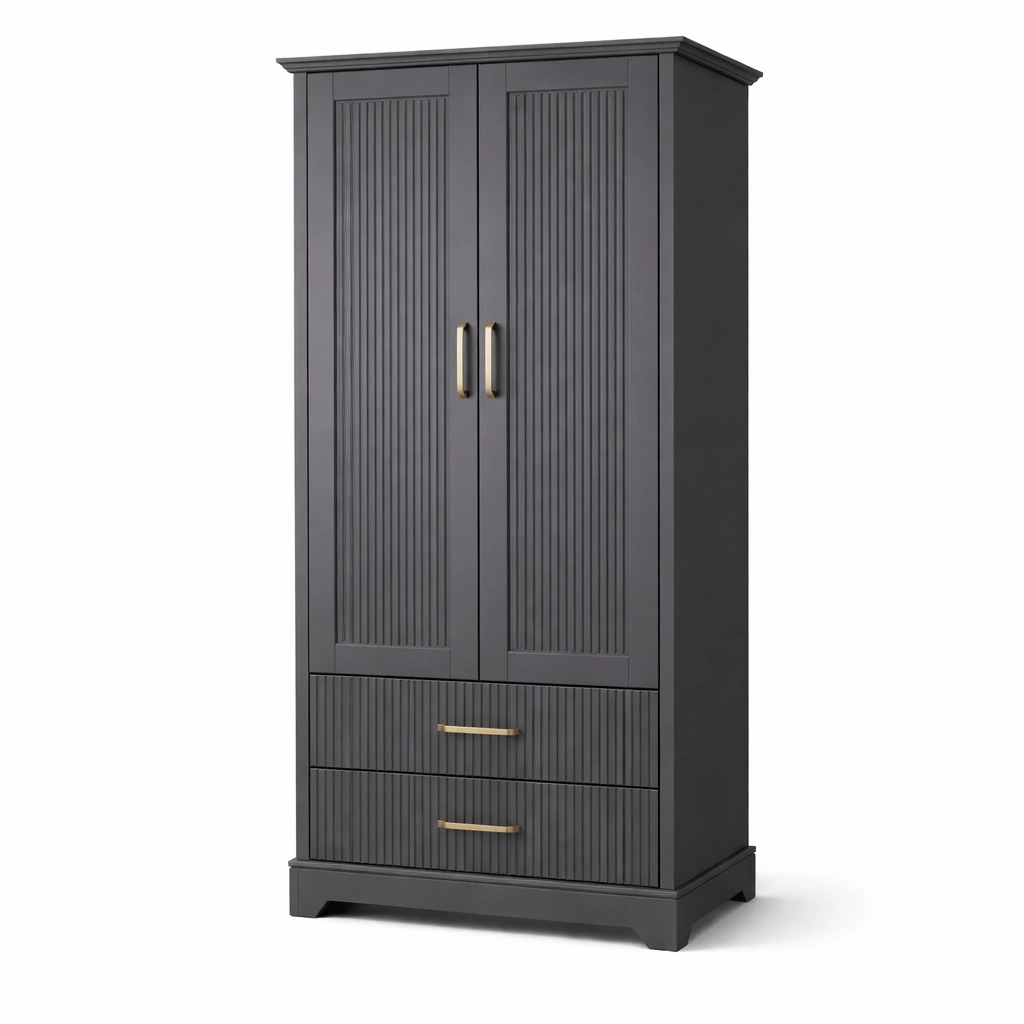 Der Kleiderschrank besteht aus MDF in Anthrazit. Er hat die Maße 80 cm Breite, 180 cm Höhe und 50 cm Tiefe. Der Schrank verfügt über Schwenktüren, zwei Schubladen mit Metallgriffen und einstellbare Regalböden. Die Oberflächen sind lackiert.